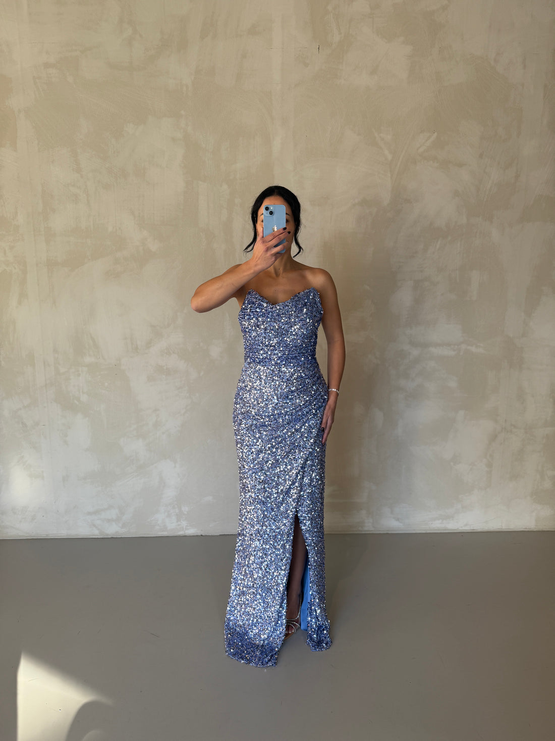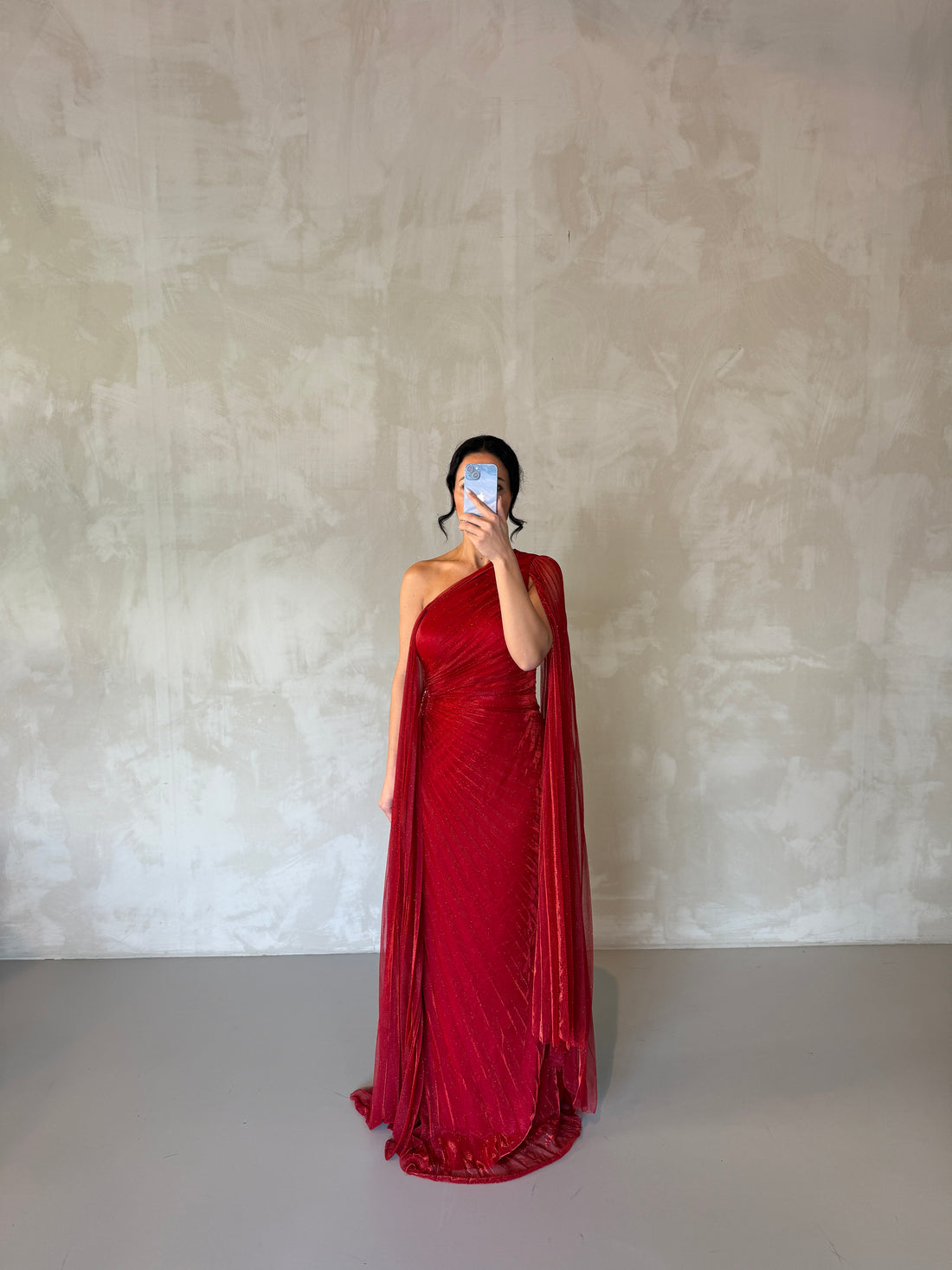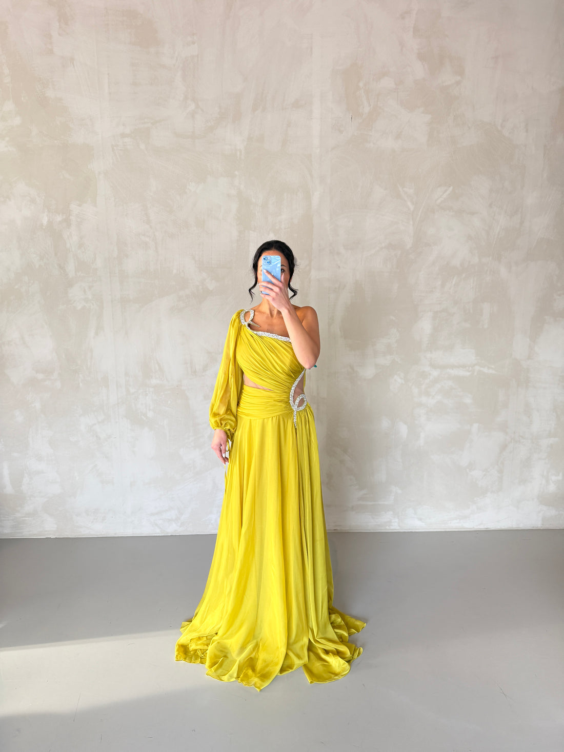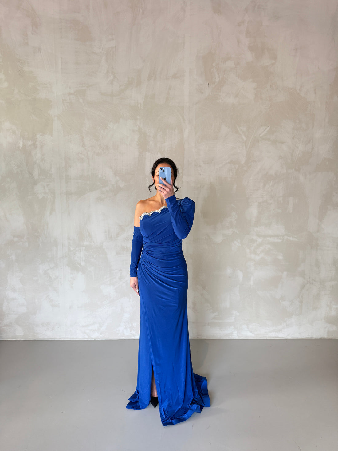 Make a stunning entrance in this elegant blue one-shoulder evening dress, designed with sparkling crystal...