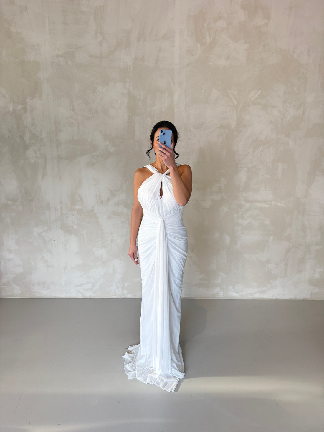 This elegant white bridal evening dress features a clean, timeless silhouette with a subtle slit...