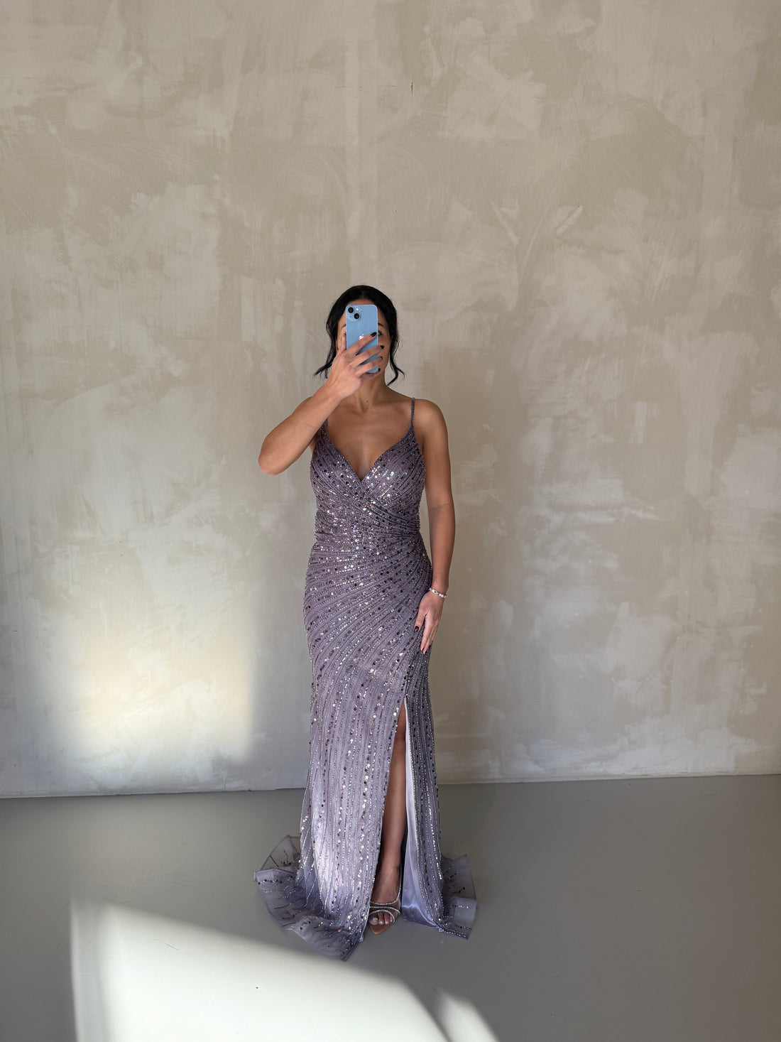 Flattering mermaid maxi dress in a stunning purple shade, designed with a V-neckline and slender...