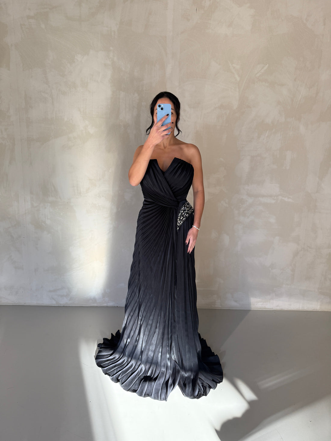 Step into elegance with this strapless chiffon dress, featuring sparkling crystals on the hip. The...